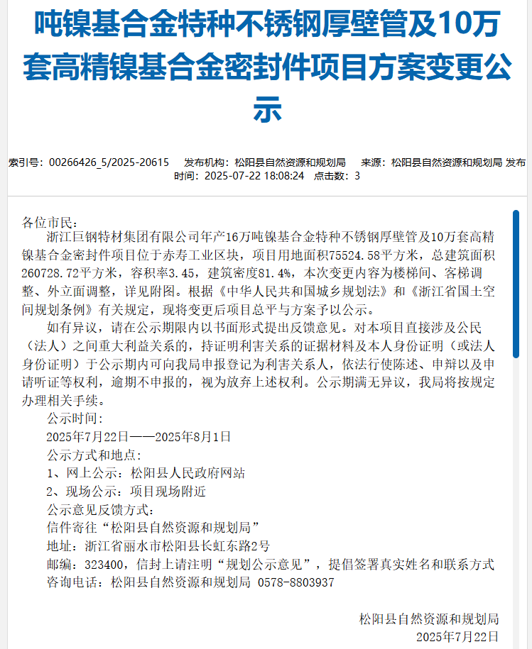2025年7月22日,浙江巨鋼特材集團(tuán)有限公司年產(chǎn)16萬(wàn)噸鎳基合金特種不銹鋼厚壁管及10萬(wàn)套高精鎳基合金密封件項(xiàng)目方案變更公示,公示時(shí)間:2025年7月22日-2025年8月1日。