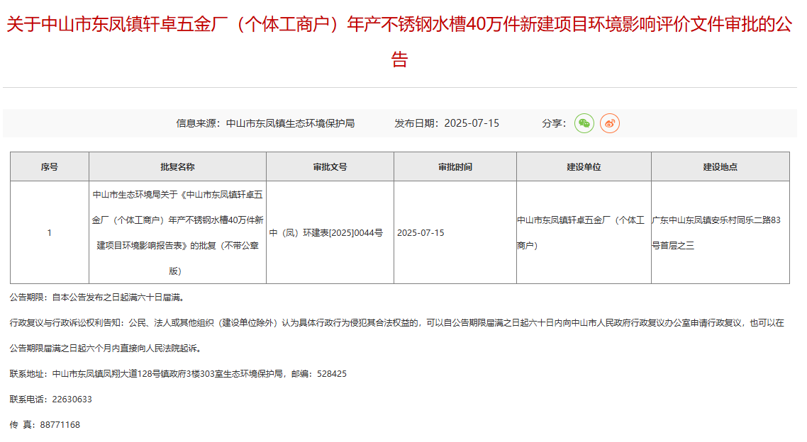 2025年7月15日,中山市東鳳鎮(zhèn)生態(tài)環(huán)境保護(hù)局就中山市東鳳鎮(zhèn)軒卓五金廠(個(gè)體工商戶)年產(chǎn)不銹鋼水槽40萬件新建項(xiàng)目環(huán)境影響評價(jià)文件作出審批意見并對外進(jìn)行公告,公告期限:自本公告發(fā)布之日起滿六十日屆滿。