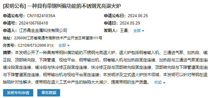 2024年6月25日,江蘇甬金金屬科技有限公司成功申請一項名為“一種具有帶鋼糾偏功能的不銹鋼光亮退火爐”專利,申請公布號CN118241035A,申請日期為2024年5月29日。
