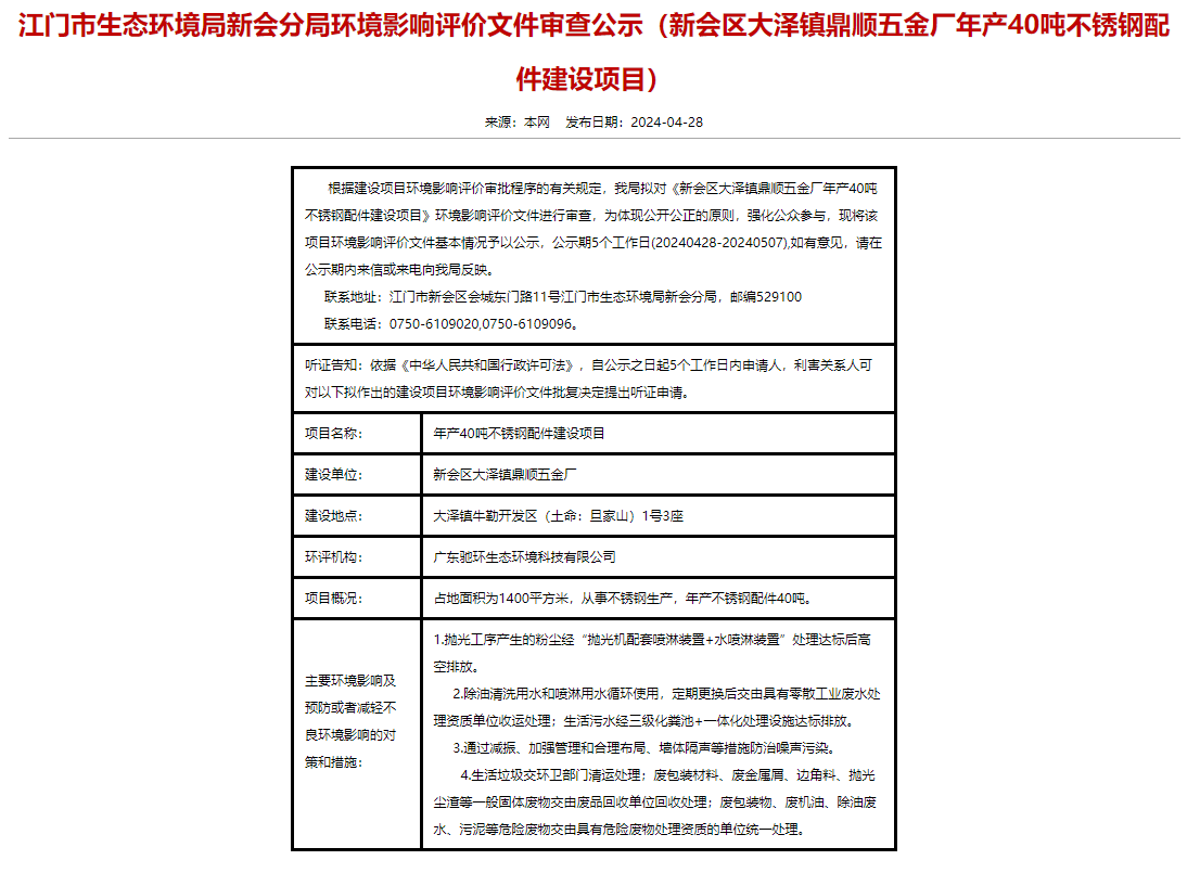 4月28日,江門市生態(tài)環(huán)境局新會(huì)分局就新會(huì)區(qū)大澤鎮(zhèn)鼎順五金廠年產(chǎn)40噸不銹鋼配件建設(shè)項(xiàng)目環(huán)境影響評(píng)價(jià)文件進(jìn)行審查公示,公示期5個(gè)工作日(20240428-20240507)。