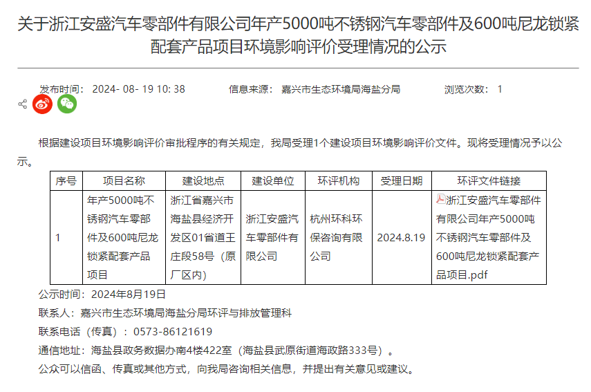 8月19日,嘉興市生態(tài)環(huán)境局海鹽分局受理浙江安盛汽車零部件有限公司年產(chǎn)5000噸不銹鋼汽車零部件及600噸尼龍鎖緊配套產(chǎn)品項目環(huán)境影響評價報告表并對外進行公示。