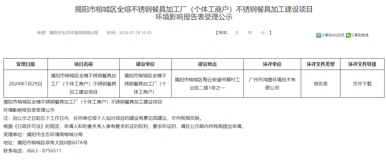 7月30日,揭陽市生態(tài)環(huán)境局榕城分局受理揭陽市榕城區(qū)全煊不銹鋼餐具加工廠(個體工商戶)不銹鋼餐具加工建設(shè)項(xiàng)目環(huán)境影響評價報告表并對外進(jìn)行公示,公示期:5個工作日。